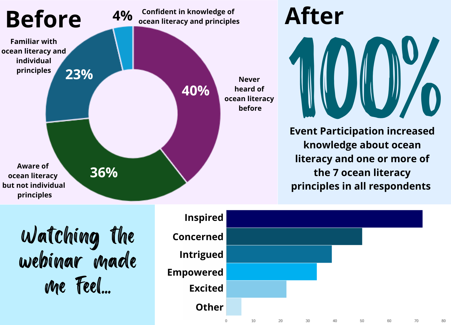 While most participants who completed polls or surveys about our webinars and first two in-person events had never heard of ocean literacy before, every single one of them felt more knowledgeable about ocean literacy and one or more of the seven Ocean Literacy Principles afterwards.