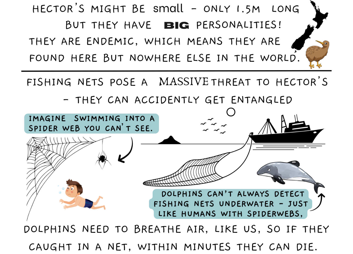 In addition, the Hector's average lifespan is about 25 years and females have to get to 5- 9 years old before they can give birth. On top of that they can only have one calf about every 2-4 years. When raising young dolphins, the dads don't help so all the mums try and group together to look after the calves (baby dolphins) which need nursing until they're about 2 years old. All of these things combined mean even if these human threats went away, our population can only grow very slow.